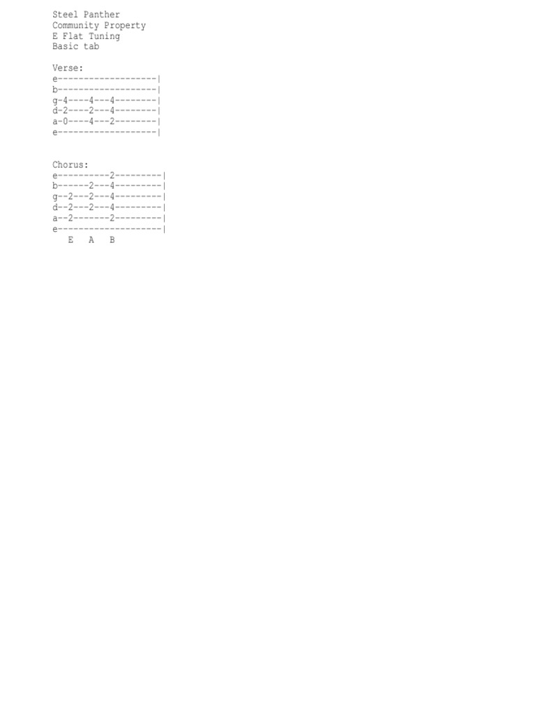 E A D G B E. Ab Cm Bb Eb E Chords for Steel Panther - Community Property with Lyrics with song key BPM capo transposer play along with guitar piano ukulele mandolin. Community Property Chords - Steel Panther Version 1.